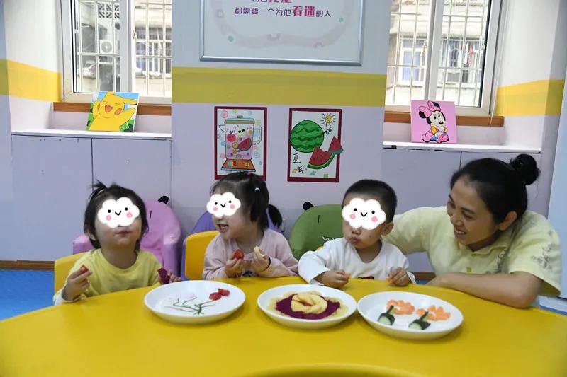 下午茶时光,食堂里摆开了“彩虹水果拼盘”:现切的苹果、香蕉、桃子、火龙果,颜色鲜亮地码在盘里。师傅们不仅要满足孩子们的味觉与营养,还会借着分水果的机会,教他们认识水果种类、分辨颜色,把甜蜜时光变成 “营养+教育+习惯”的自然成长课。一口果香回甘在舌尖,知识也悄悄住进了心里。