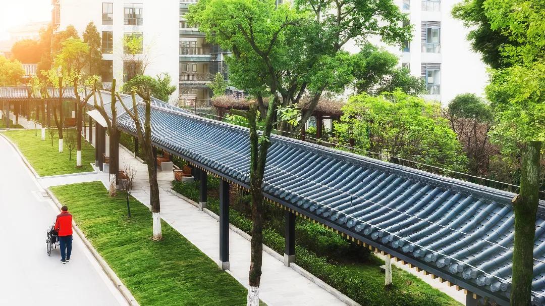 风雨连廊在设计上融入新中式风格与巴渝山城元素,暖灰色调与人字形坡顶勾勒出宁静雅致的院落画卷。沿途不仅设有休憩椅,还点缀着雅致的屏风,老人们可以随时停下脚步,聊聊天、看看景。此外,连廊步道地面做了防滑处理,宽度也拓宽至2.3米,方便轮椅、助行器通行。