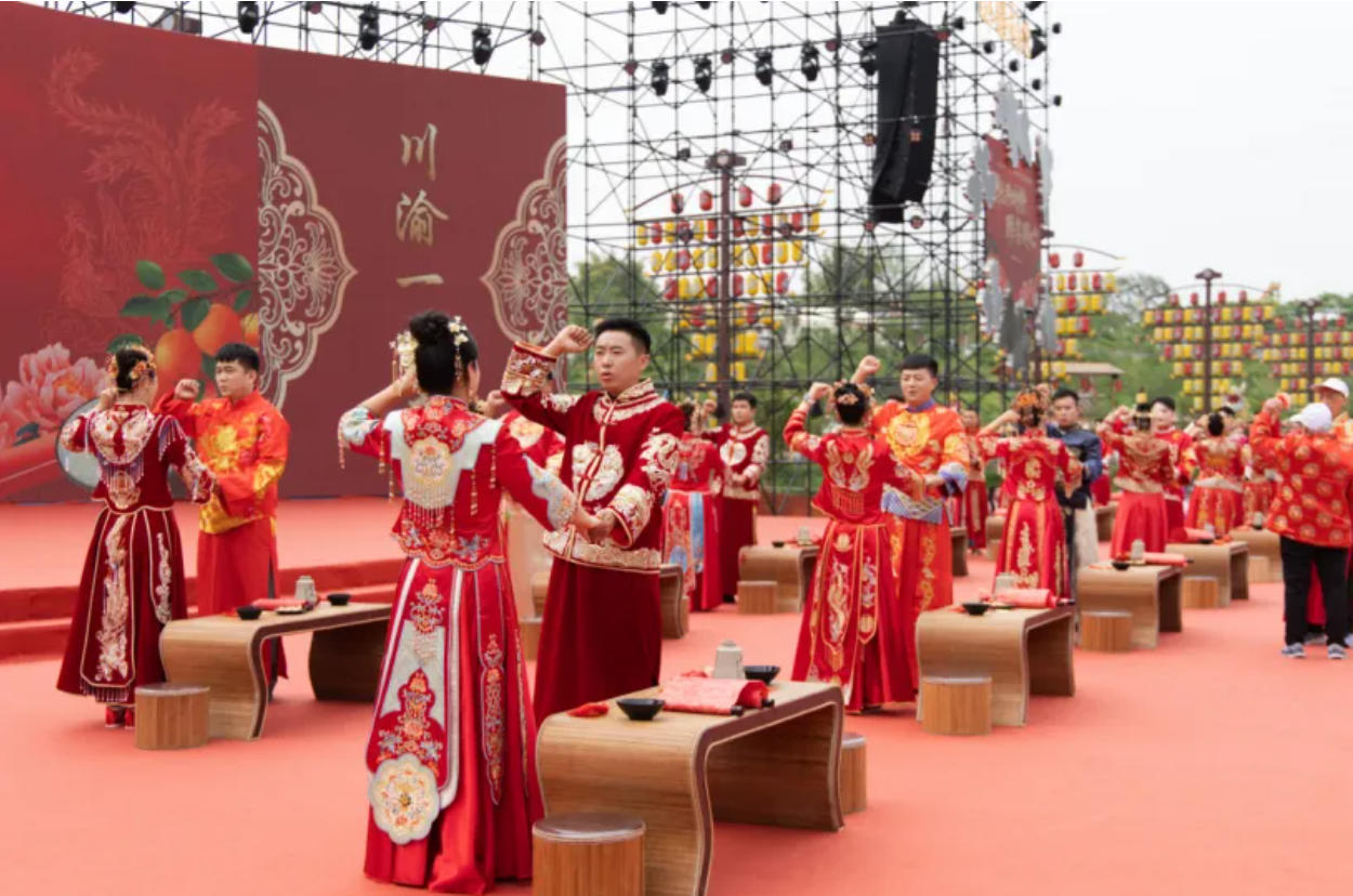 仪式上,垫江丹皮、邻水脐橙、大竹醪糟等特色物产依次亮相,既传递着三地情谊,也为新人送上美好祝福。诵读婚书、结发执手、共饮合卺酒、簪花定情,一系列传统礼仪有条不紊地进行,每一个细节都承载着中式婚嫁的文化底蕴。