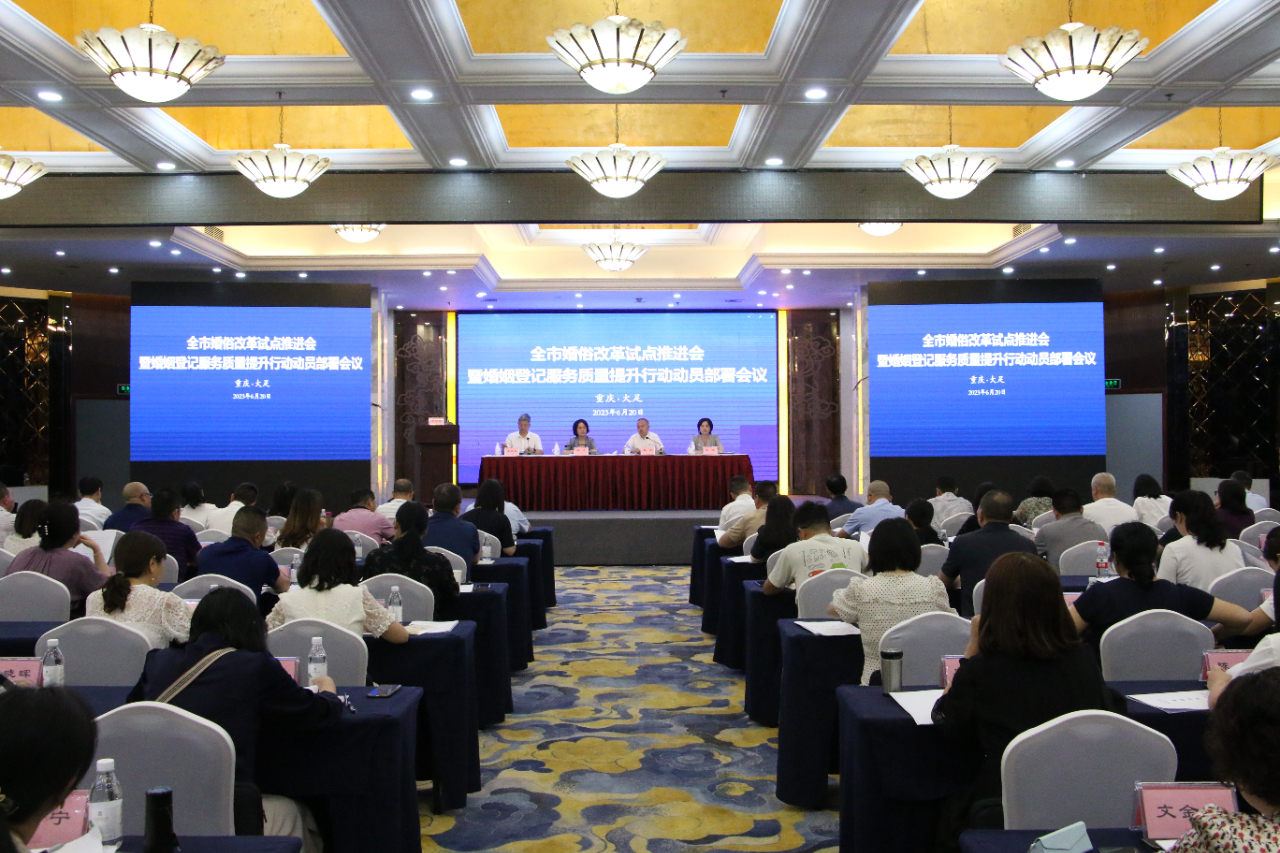 6月20日,我市在大足区召开婚俗改革试点推进会暨婚姻登记服务质量提升行动动员部署会议,总结分析全市婚俗改革试点和婚姻登记情况,安排部署有关工作。市民政局二级巡视员胡立出席会议并讲话。