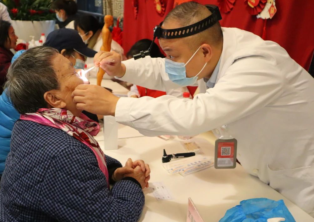 市人民医院老年病科党支部医护党员现场开展健康义诊,为老人提供健康咨询、报告解读、用药指导、常规检查等服务,并有针对性地提出诊疗建议。