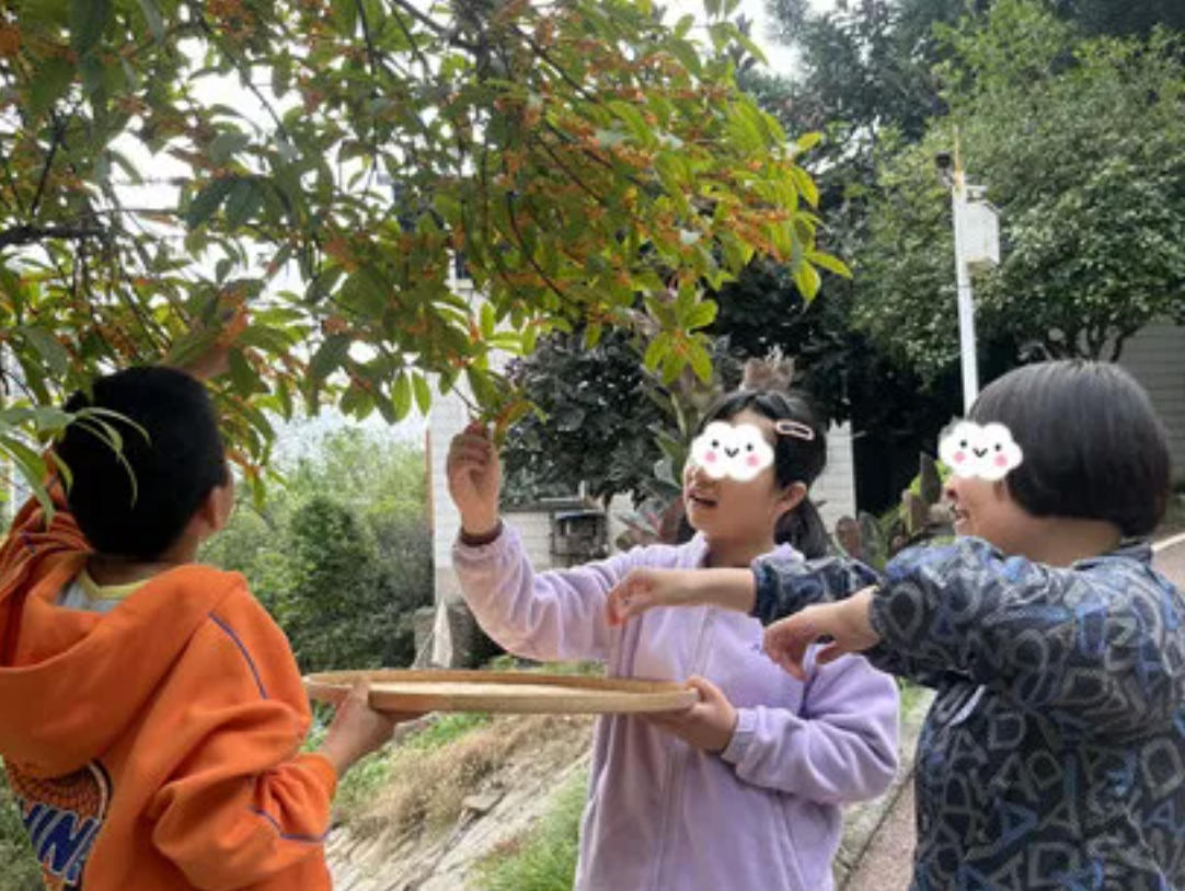 采桂是一场充满乐趣的金色游戏。孩子们分组协作,有的踮脚巧手慢摘,有的轻摇枝条,有的用竹竿巧敲,任金黄色的桂花如雨般簌簌飘落。大家手捧竹篮,满心欢喜地接住这份季节的馈赠,随后围坐在一起仔细挑拣、去除杂叶。在分工协作与耐心劳作中,孩子们学会了珍惜劳动成果,也体会到了合作的快乐。
