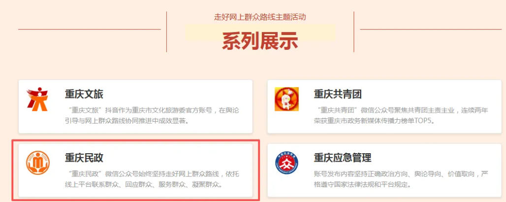 近日,市委网信办组织开展“走好网上群众路线成绩突出账号”展示活动,集中展示宣介一批重庆市内相关党政机关、群众团体、国有企事业单位、新闻机构等单位和党员干部个人运营成绩突出账号的经验做法,“重庆民政”微信公众号入选。