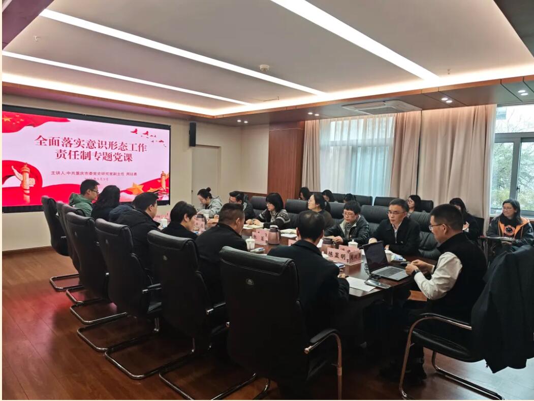 此次党课邀请中共重庆市委党史研究室副主任周廷勇授课。周廷勇以“全面落实意识形态工作责任制”为题,从习近平总书记关于意识形态工作的重要论述精神,结合当前社会热点与意识形态概念功能切入,系统梳理了国际国内形势的新变化,深入分析了当前意识形态工作面临的新形势新挑战,并结合贯彻落实党的二十届四中全会精神,对压紧压实意识形态工作责任制进行了系统讲解。讲课视野宏阔、案例鲜活、分析透彻,深刻阐释了意识形态工作的核心要义与实践要求,为全体党员干部做好新形势下意识形态工作提供了清晰的理论指引和实践路径。