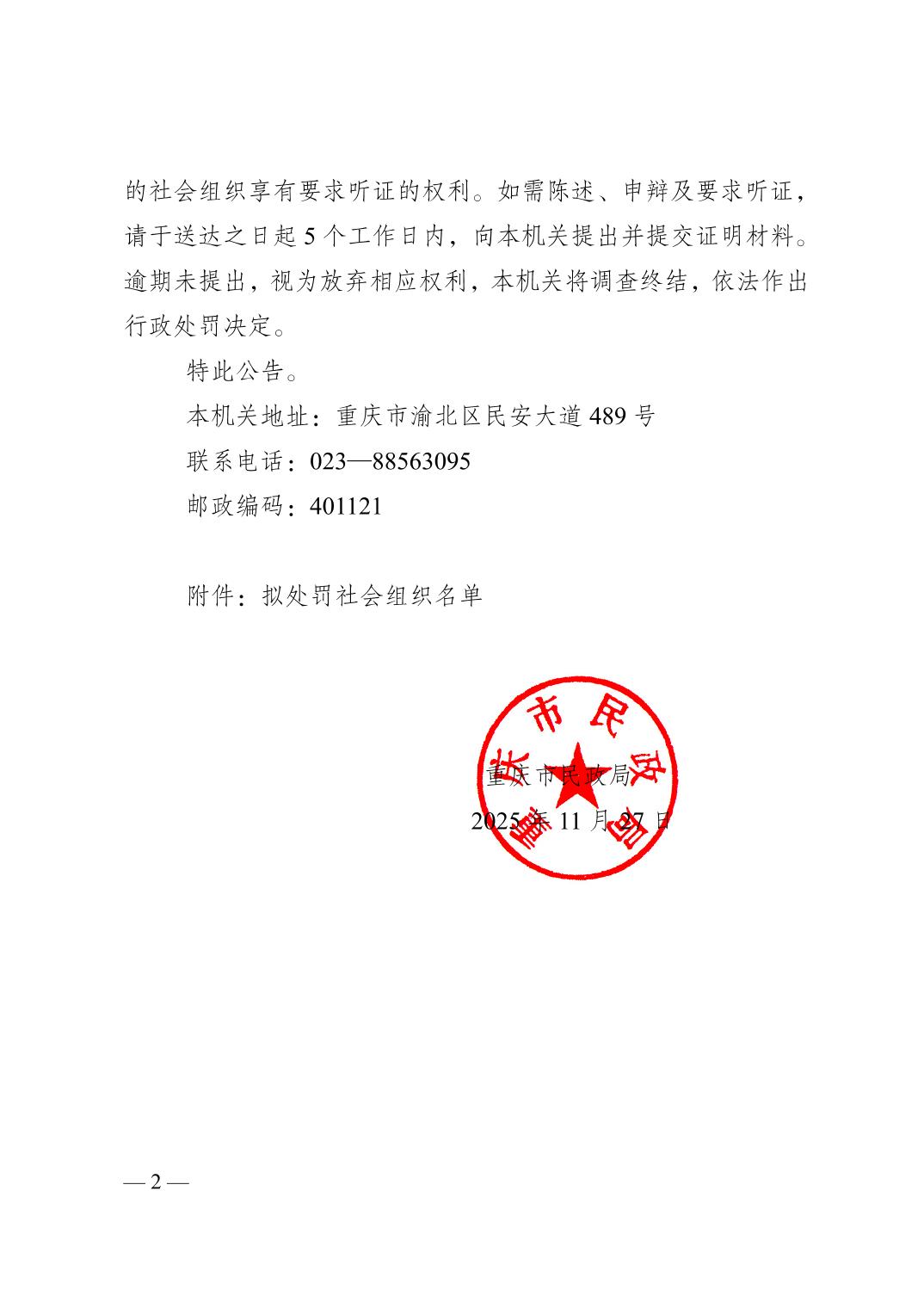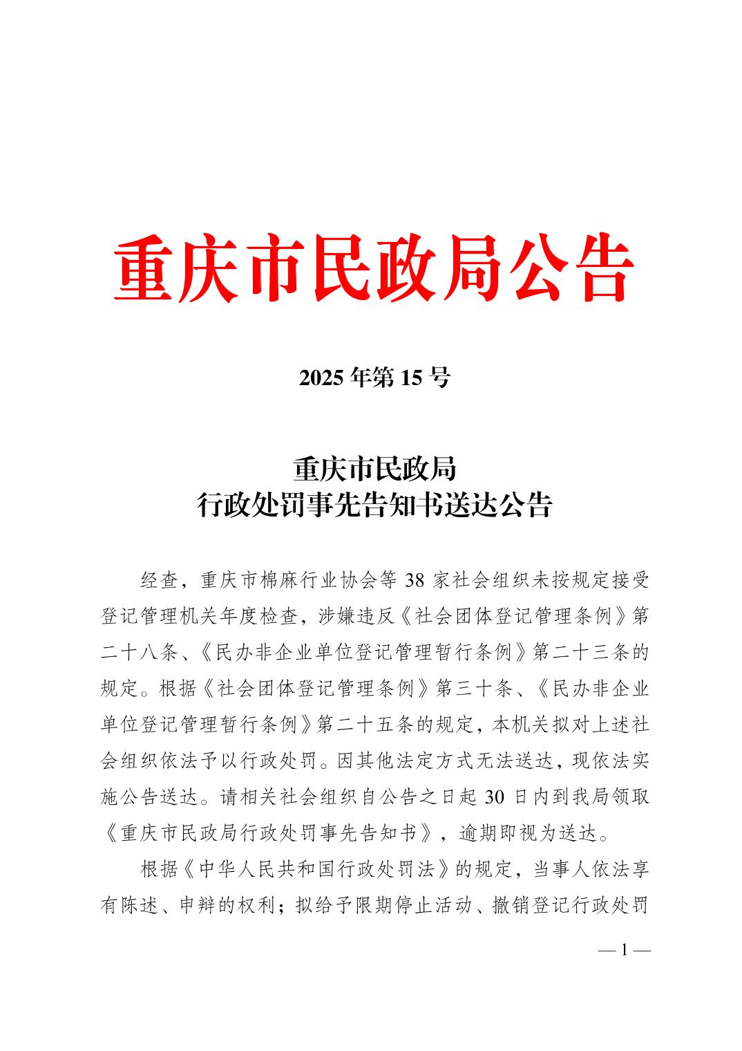 重庆市民政局行政处罚事先告知书送达公告(2025年第15号)